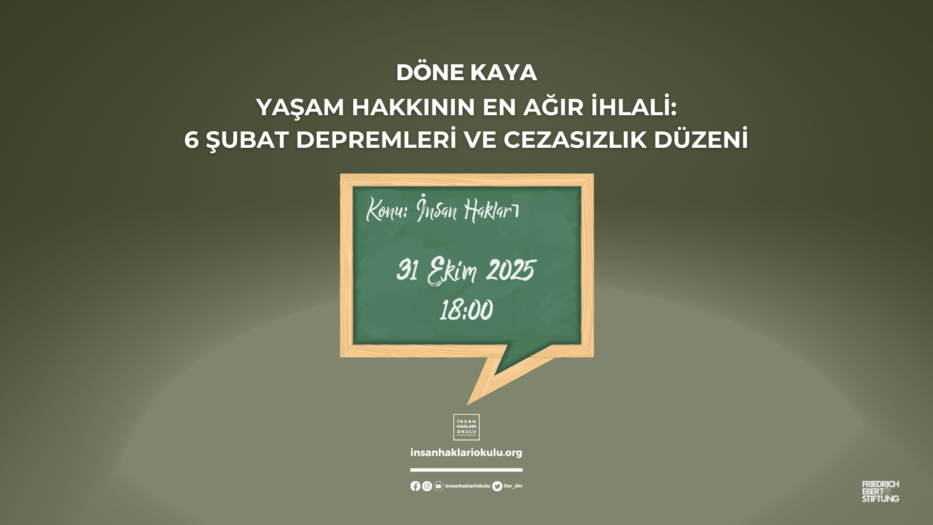 Konu: İnsan Hakları başlıklı seminer dizisinde Döne Kaya ile Yaşam Hakkının En Ağır İhlali: 6 Şubat Depremleri ve Cezasızlık Düzeni üzerine konuşacağız. 31 Ekim 2025 Cuma günü saat 18.00’de başvuru formunu dolduran ilk 20 lisans öğrencisi ile Ankara’da İnsan Hakları Okulu ofisinde bir araya geliyoruz.
