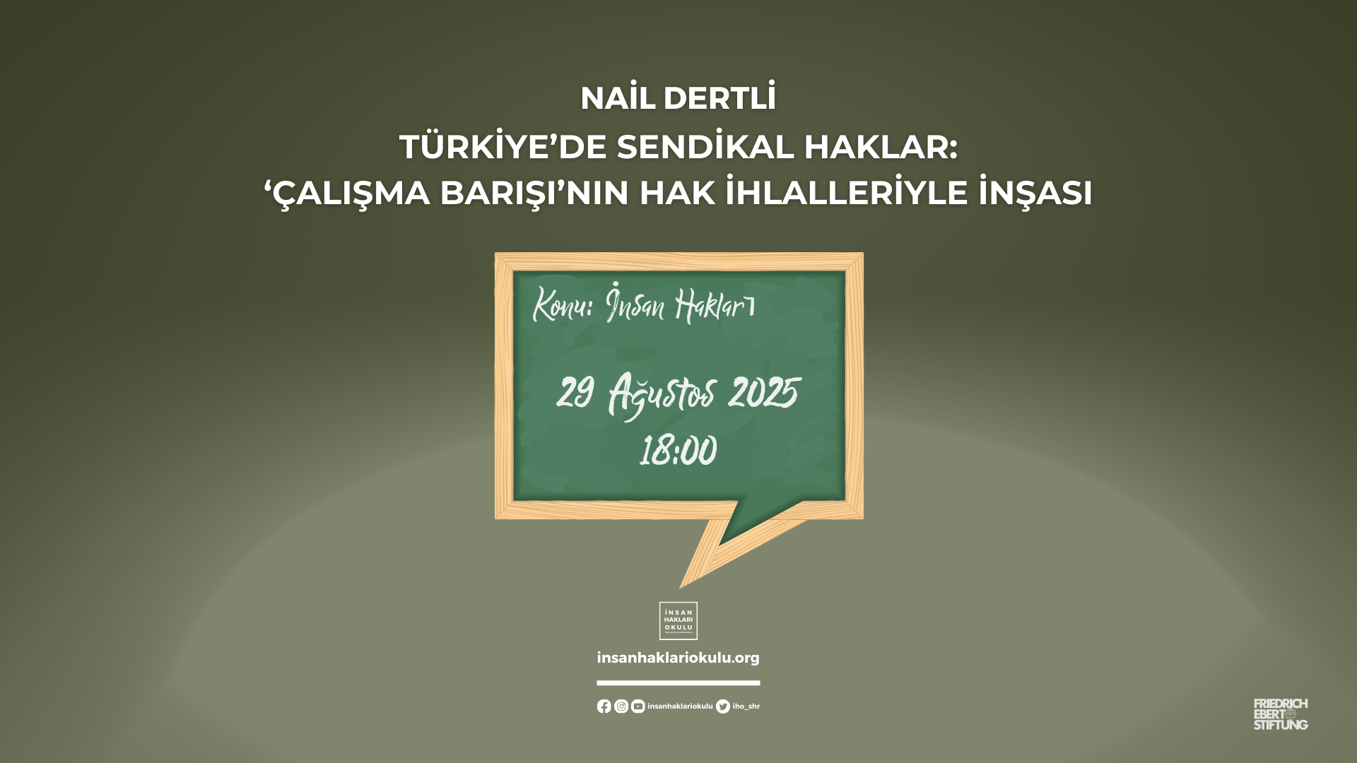Konu: İnsan Hakları başlıklı seminer dizisinde Nail Dertli ile Türkiye’de Sendikal Haklar: Çalışma Barışı’nın Hak İhlalleriyle İnşası üzerine konuşacağız. 29 Ağustos 2025 Cuma günü saat 18.00’de başvuru formunu dolduran ilk 20 lisans öğrencisi ile Ankara’da İnsan Hakları Okulu ofisinde bir araya geliyoruz.