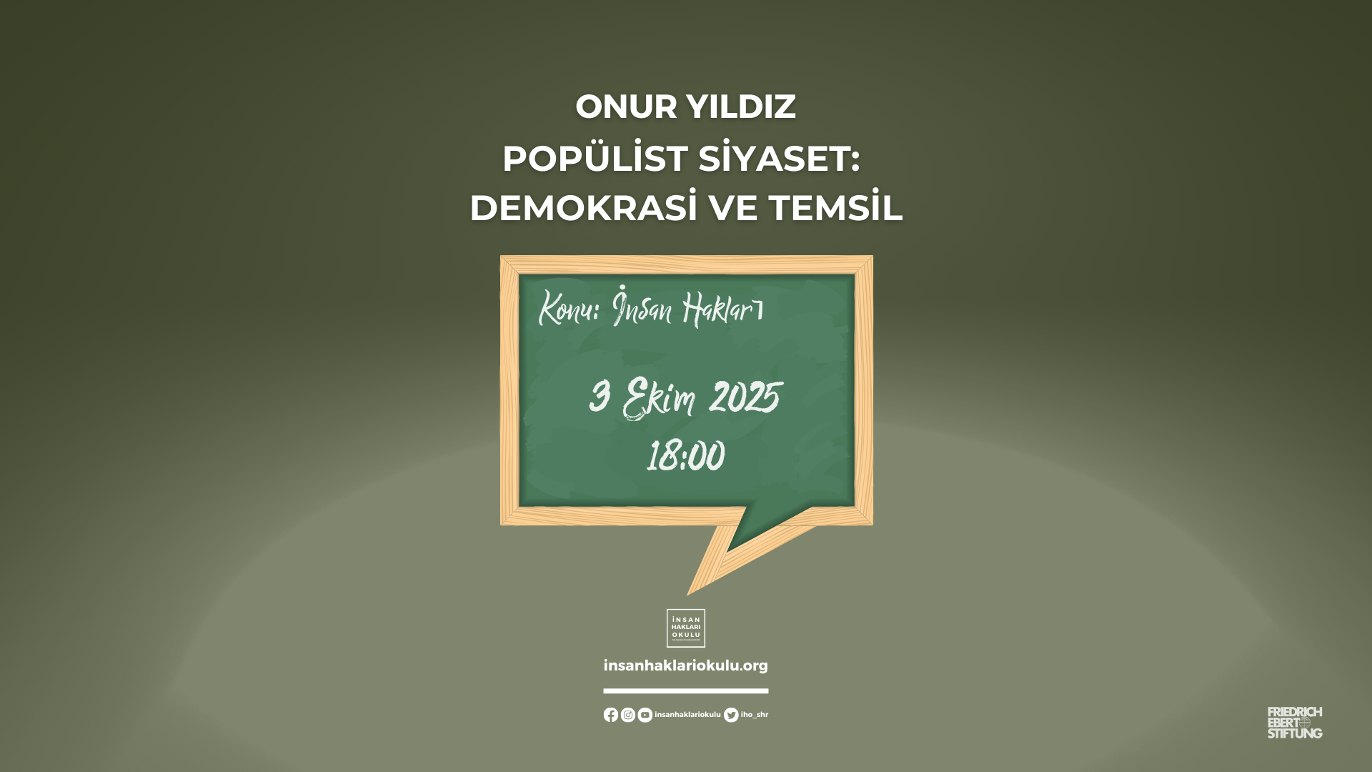Konu: İnsan Hakları başlıklı seminer dizisinde Onur Yıldız ile Popülist Siyaset: Demokrasi ve Temsil üzerine konuşacağız. 3 Ekim 2025 Cuma günü saat 18.00’de başvuru formunu dolduran ilk 20 lisans öğrencisi ile Ankara’da İnsan Hakları Okulu ofisinde bir araya geliyoruz.